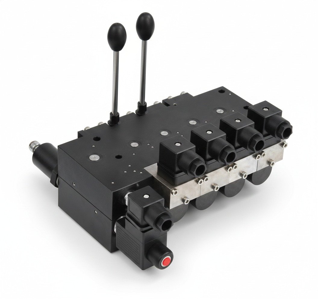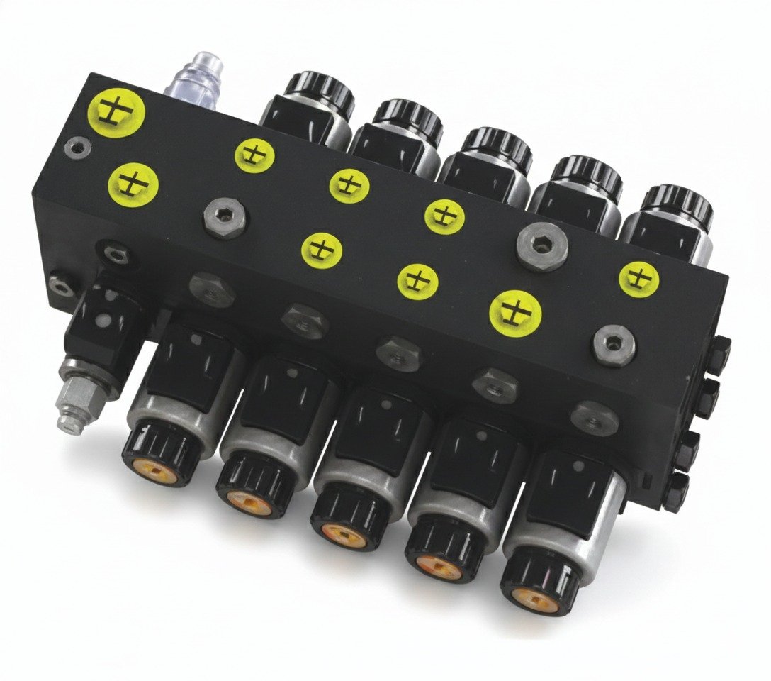 These five block Proportional directional spool valves consist of an oil inlet link, five working links and a tail link. The inlet link is a solenoid relief valve, which is used for over-limit protection of the working mechanism. When the solenoid valve is in the middle position, the hydraulic lock can prevent the mechanism from sinking.